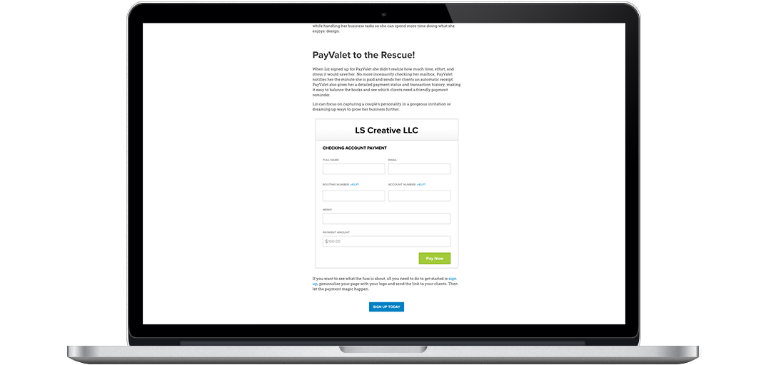 After testing out all of the existing payment options, we knew what we were looking for - and since it didn’t exist yet, we decided to build an online way to collect payments ourselves. We leveraged our backgrounds in banking and finance, and ultimately set out to build something that would help our business run more efficiently. We thought of it as a “valet service” for collecting money from our customers, so we aptly named it PayValet.
