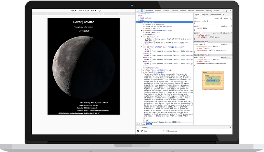 Through NASA's open API movement, we were able to tap into their data to build our "rover" to explore. Currently we've pulled in data from our moon, Mars, Hubble, and the International Space Station. With a save to home screen icon, we can pull up the site on our phones and get a quick rundown of what is beyond our planet.