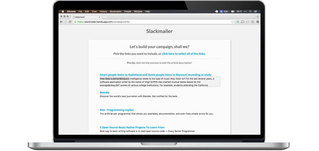 Since Slack is where we share our links internally, we thought why not use that content to populate a newsletter? There's no sense in trying to gather up all of those links again and manually entering them into a MailChimp template when you can build a Slackbot to do the work.